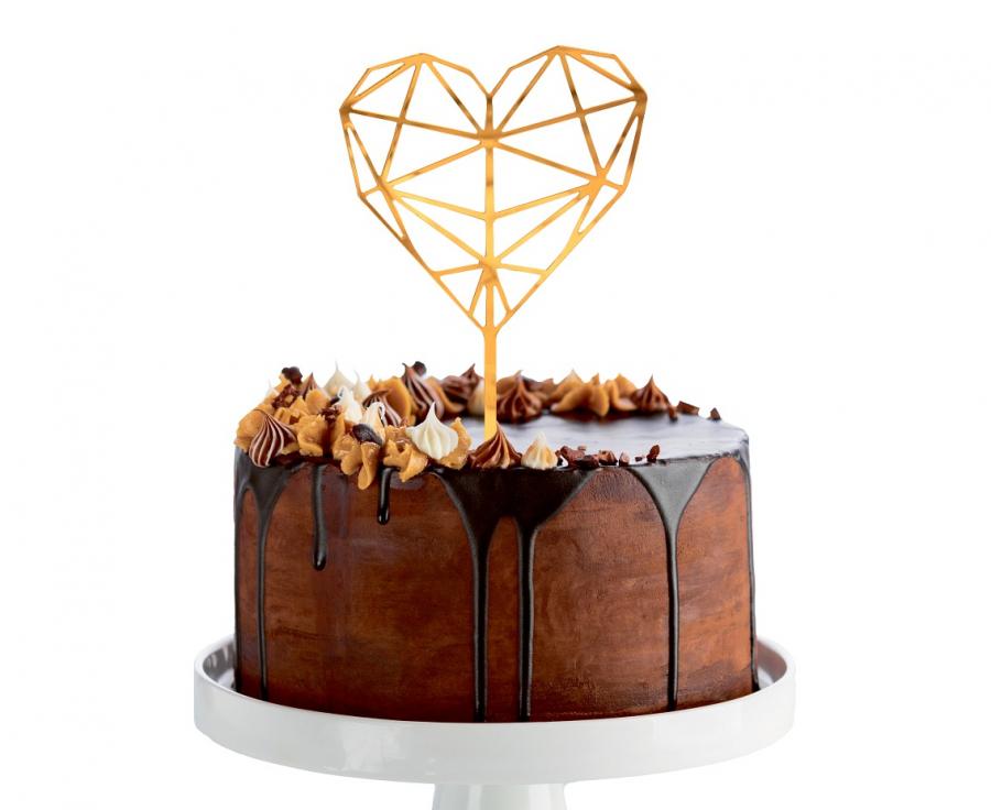 Złoty topper Diamentowe Serce to dekoracja, która nadaje tortowi elegancki charakter i przyciąga uwagę swoim geometrycznym wzorem.